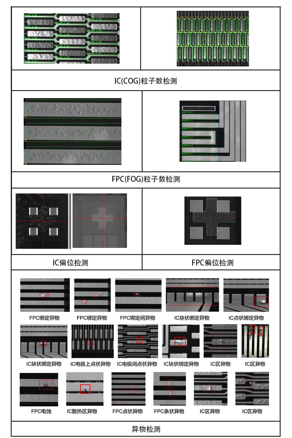 Detect the quantity (leakage pressure, particle shortage), distribution, and indentation strength (overvoltage, shallow pressure) of conductive particles on IC and FPC