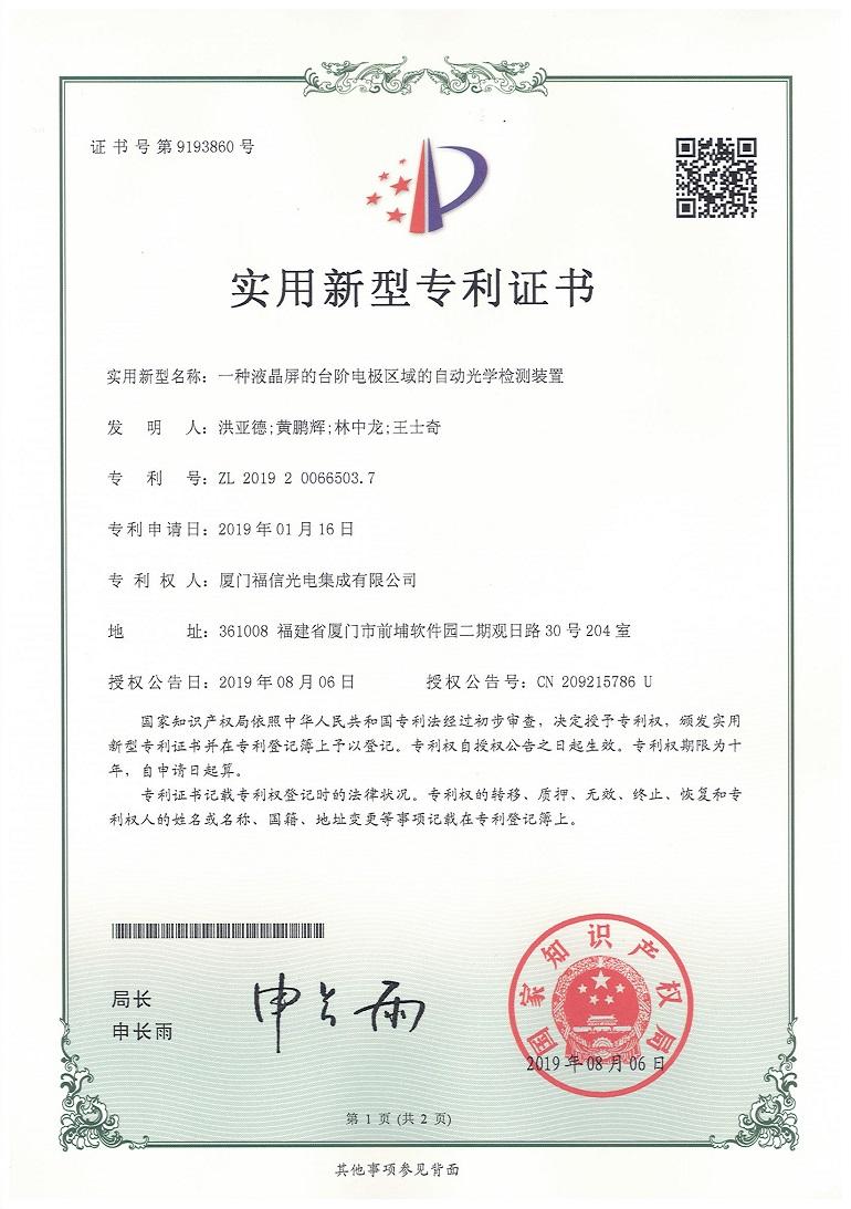 Recently, Fuxin Optoelectronics has won four utility model patents, namely, "an integrated intelligent system", "an embedded machine vision system", "a special scene recognition system based on artificial intelligence and its application recognition device", and "an automatic optical detection device for the step electrode area of the LCD screen".